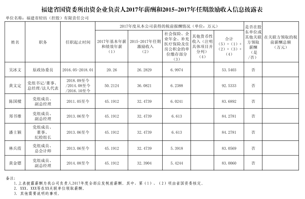 福建省輕紡(控股)有限責(zé)任公司負(fù)責(zé)人2017年薪酬和2015-2017年任期激勵收入信息披露表