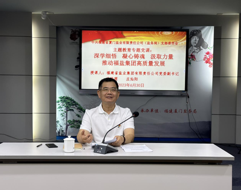 為推動(dòng)學(xué)習(xí)貫徹習(xí)近平新時(shí)代中國(guó)特色社會(huì)主義思想主題教育走深走實(shí),學(xué)深悟透黨的創(chuàng)新理論,6月30日,福鹽集團(tuán)黨委副書(shū)記、總經(jīng)理莊燦陽(yáng)到廈門(mén)鹽業(yè),以“深學(xué)細(xì)悟 凝心鑄魂 汲取力量 推動(dòng)福鹽集團(tuán)高質(zhì)量發(fā)展”為題,為廈門(mén)鹽業(yè)干部職工講授主題教育專(zhuān)題黨課。