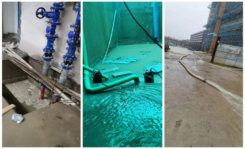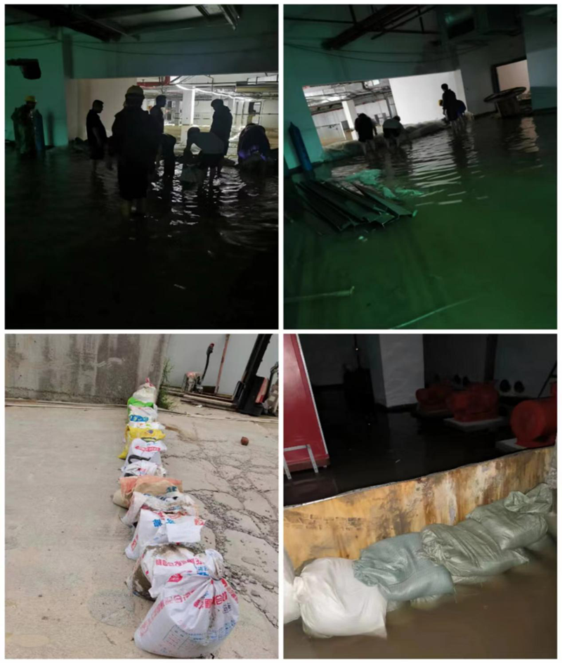 7月29日凌晨3:30,項(xiàng)目所在地再次下起了大暴雨,隨著降雨量加大,2#樓北側(cè)圍墻外內(nèi)河河水倒灌,項(xiàng)目工地積水水位不斷上漲,地下室集水坑臨時(shí)水泵由于出水口積水水位比出水口高,所以導(dǎo)致臨時(shí)水泵無(wú)效,險(xiǎn)情再次出現(xiàn)。搶險(xiǎn)突擊隊(duì)迅速在2#樓北側(cè)圍墻外內(nèi)河河水倒灌口處,筑高堤壩進(jìn)行攔堵河水倒灌;加高圍堰,攔截雨水進(jìn)入地下室;重新規(guī)劃抽水泵位置,將雨水排放到市政雨水井,防治雨水再次倒灌;在地下室生活泵房四周用沙袋筑起圍堰防止雨水流入,浸泡設(shè)備,并對(duì)地下室生活泵房集水坑臨時(shí)水泵進(jìn)行疏通,降低泵房水位;在空調(diào)機(jī)房四周進(jìn)行圍堵,減少雨水流入浸泡機(jī)房;增加兩臺(tái)5.5KW大功率水泵進(jìn)行排水,降低機(jī)房水位。