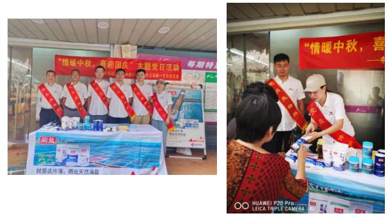 漳州鹽業(yè)黨總支開展“情暖中秋,喜迎國慶”主題黨日活動,各黨支部黨員發(fā)揮先鋒模范作用,堅持?jǐn)[攤設(shè)點、走村入戶入店巡訪市場、加強宣傳,了解餐飲、食堂、農(nóng)村人群、城市人群閩鹽食用情況,結(jié)合濃厚的節(jié)日氛圍,開展品牌宣傳活動,宣傳科學(xué)用鹽的健康理念。