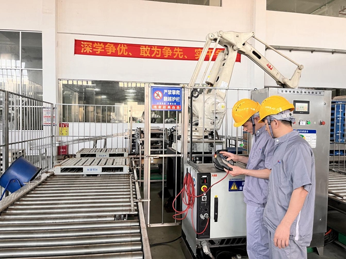 機(jī)修人員在調(diào)整碼垛機(jī)械手疊垛程序