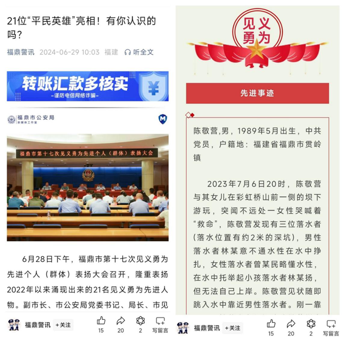 陳敬營見義勇為先進事跡在福鼎警訊平臺發(fā)布