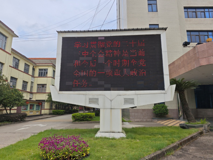 青山紙業(yè)門口LED大屏幕滾動(dòng)播放黨的二十屆三中全會(huì)宣傳標(biāo)語(yǔ)